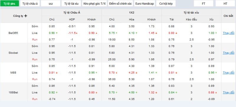 - Bước 4: Hệ thống hiển thị chi tiết kèo châu Á, châu Âu, tài xỉu cùng thời gian biến động.