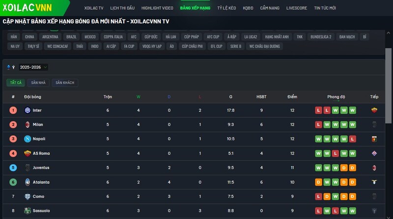 - Bảng xếp hạng liên tục được làm mới, đặc biệt là Seria A, Ngoại hạng Anh và La Liga.